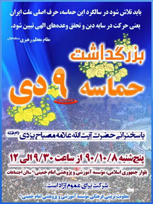 در آستانه فرارسيدن سالروز حماسه مردم هميشه در صحنه ايران در 9 دي، مراسم بزرگداشتي به همين مناسبت با سخنراني حضرت آيه الله علامه مصباح يزدي حفظه الله برگزار مي گردد.