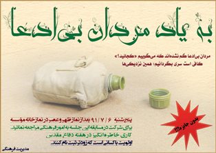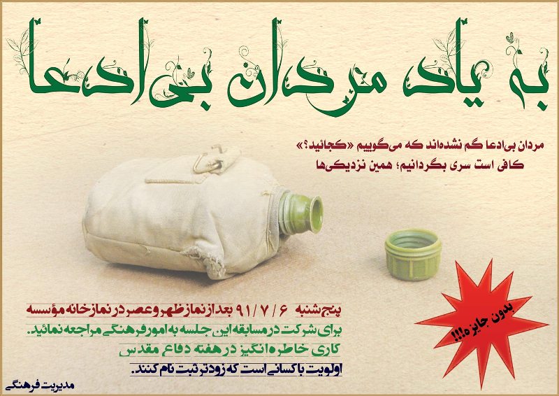 به همت مديريت فرهنگي و به مناسبت هفته دفاع مقدس مسابقهاي با عنوان "به ياد مردان بي ادعا" برگزار ميگردد و با توجه به اين عنوان، جايزهاي براي شرکت کنندگان در مسابقه در نظر گرفته نخواهد شد.