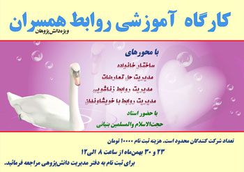 به همت مديريت دانش پژوهي کارگاه آموزشي روابط همسران ويژه دانش پژوهان برگزار خواهد شد.