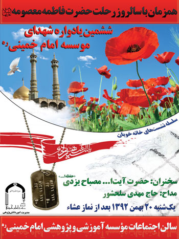 همزمان با سالروز رحلت حضرت فاطمه معصومه سلام الله عليها ششمين يادواره شهداي موسسه آموزشي و پژوهشي امام خميني ره با سخنراني حضرت علامه مصباح يزدي حفظه الله برگزار مي گردد.
