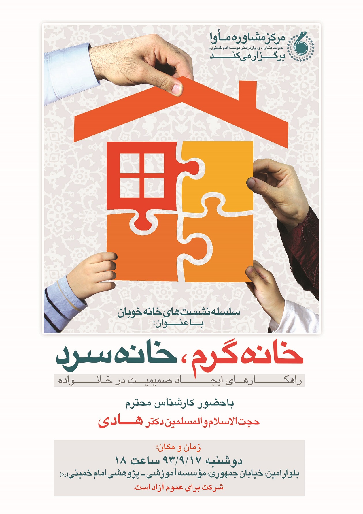 عنوان جلسه: "خانه گرم، خانه سرد (راهكارهاي ايجاد صميميت در خانواده)"