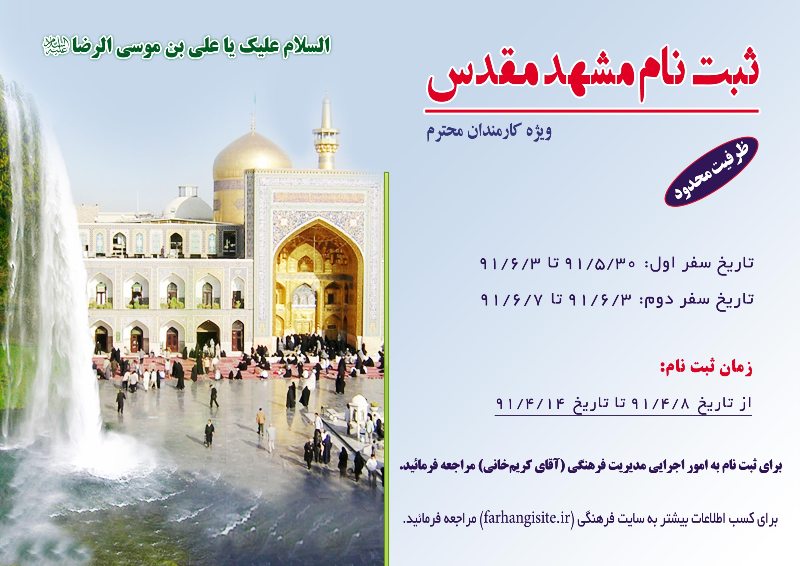 به همت معاونت فرهنگي تربيتي مؤسسه و طبق روال سنوات گذشته ثبت نام اردوي زيارتي مشهد مقدس آغاز گرديد.
