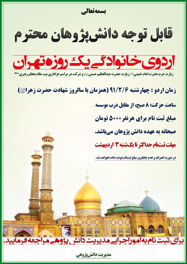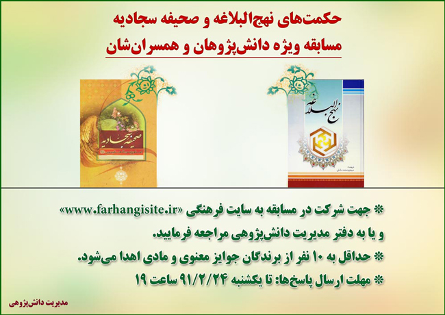 علاقمندان به شرکت در اين مسابقات مي توانند جهت ثبتنام تا تاریخ 18/2/91 به دفتر امور دانشپژوهی معاونت فرهنگي تربيتي مراجعه فرمايند.